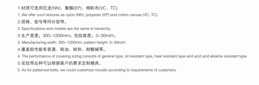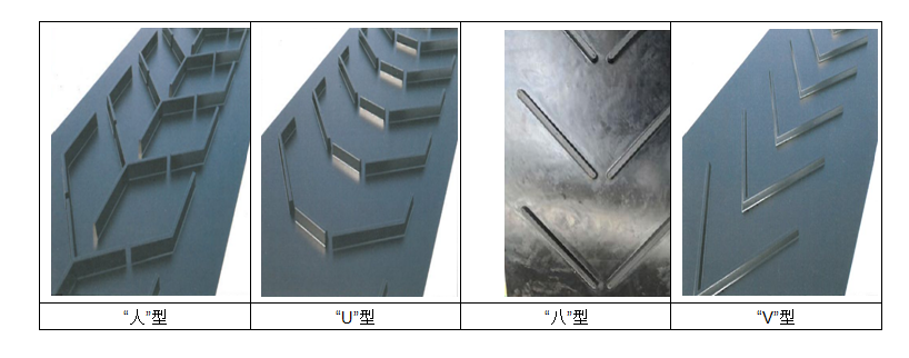 表面有花紋,可增加運(yùn)載物與帶體的摩擦系數(shù).花紋模板有人字形花紋,八字型花紋,點(diǎn)式花紋.花紋模板可定做.