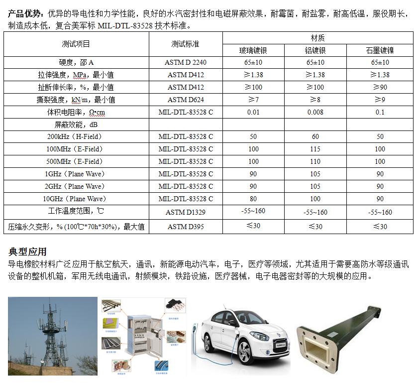 復合導電橡膠條是將含銀等導電金屬粉體通過機械共混的方式在硅橡膠或其他橡膠中混合均勻,在特定工藝參數(shù)下采用復合擠出成型與不導電硅橡膠化學結合制備的一種新型高分子材料。具有良好的導電性和電磁屏蔽效能,優(yōu)異的水汽密封性、耐鹽霧,耐霉菌,耐高低溫,服役期長,制造成本低廉。按照材質不同可分為純銀,鋁鍍銀,玻璃鍍銀,銅鍍銀和石墨鍍鎳等。